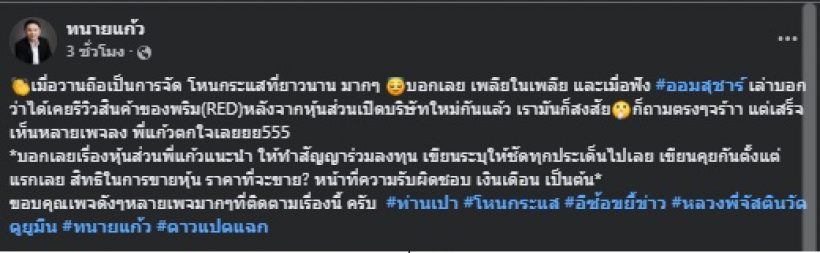 ด้านทนายแก้วได้โพสต์ความเห็นผ่านเพจส่วนตัว ขอบคุณแฟนรายการและเพจข่าวที่ติดตาม พร้อมให้คำแนะนำว่า การทำธุรกิจร่วมกันควรทำสัญญาร่วมลงทุนให้ชัดเจนตั้งแต่ต้น กำหนดสิทธิ หน้าที่ ความรับผิดชอบ และข้อตกลงเกี่ยวกับการขายหุ้น เพื่อป้องกันปัญหาในอนาคต
