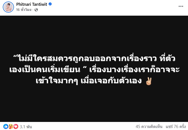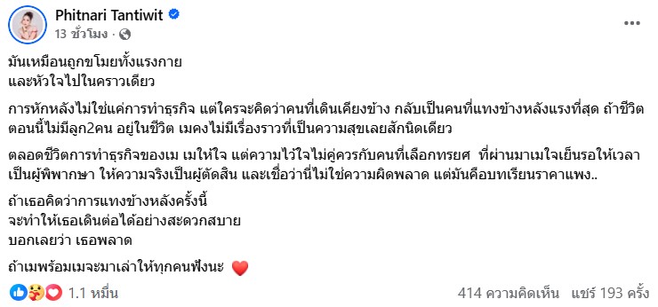 ในโพสต์ของเมระบุว่า ไม่มีใครสมควรถูกลบออกจากเรื่องราวที่ตัวเองเป็นคนเริ่มเขียน เรื่องบางเรื่องอาจจะเข้าใจได้ก็ต่อเมื่อเจอกับตัวเอง พร้อมบอกว่าความรู้สึกครั้งนี้เหมือนถูกขโมยทั้งแรงกายและหัวใจไปพร้อมกัน การหักหลังไม่ใช่เพียงเรื่องธุรกิจ แต่ยิ่งเจ็บปวดเพราะเป็นคนที่เคยเดินเคียงข้างกันมาก่อน
