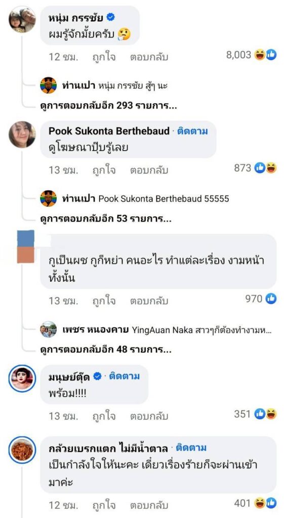 กระแสข่าวนี้ทำให้แฟนคลับและเพจต่างๆ เข้าไปคอมเมนต์จำนวนมาก หนึ่งในนั้นคือพิธีกรชื่อดัง หนุ่ม กรรชัย ที่เข้าไปแสดงความเห็นเพื่อสอบถามถึงเรื่องราว ก่อนที่เพจเจ้าของข่าวจะตอบกลับด้วยการให้กำลังใจ