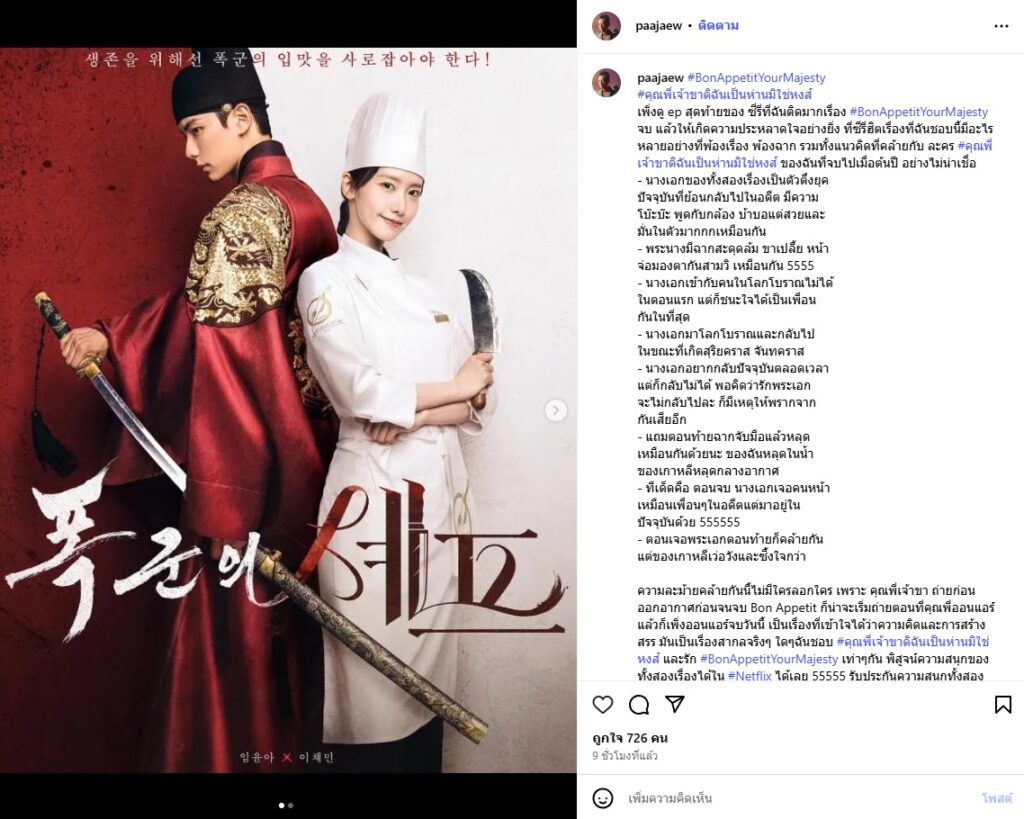 ผู้กำกับชื่อดัง ป้าแจ๋ว ยุทธนา สร้างความฮือฮาอีกครั้ง หลังออกมาโพสต์ข้อความยาวผ่านอินสตาแกรมส่วนตัว หลังเพิ่งดูตอนจบของซีรีส์เกาหลีเรื่อง Bon Appetit Your Majesty ซึ่งเป็นซีรีส์ที่กำลังเป็นกระแสและเพิ่งลาจอไปหมาด ๆ