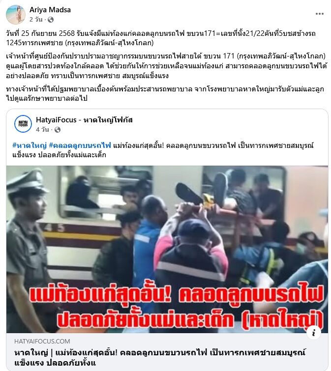 วันที่ 25 กันยายน 2568 เจ้าหน้าที่บนขบวนรถไฟสายใต้ หมายเลข 171 (กรุงเทพอภิวัฒน์ – สุไหงโกลก) ได้รับแจ้งเหตุผู้โดยสารหญิงตั้งครรภ์มีอาการปวดท้องอย่างกะทันหัน จึงเร่งเข้าช่วยเหลืออย่างใกล้ชิด เหตุการณ์เกิดขึ้นบริเวณตู้โดยสารที่ 5 หมายเลขที่นั่ง 21/22 ข้างรถหมายเลข 1245 เจ้าหน้าที่ได้ช่วยเหลืออย่างปลอดภัยและทารกเพศชายคลอดออกมาแข็งแรงสมบูรณ์