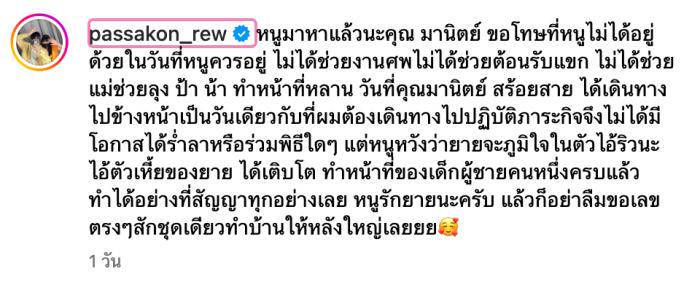 ริวได้โพสต์ข้อความผ่านอินสตาแกรมส่วนตัว บอกเล่าความรู้สึกอาลัยถึงคุณยาย พร้อมกล่าวถึงความเสียใจที่ไม่ได้อยู่ร่วมในช่วงเวลาสำคัญกับครอบครัว แต่ย้ำว่าตนเองจะทำหน้าที่ของหลานชายให้ดีที่สุด และหวังว่าคุณยายจะภาคภูมิใจในสิ่งที่ได้ทำ