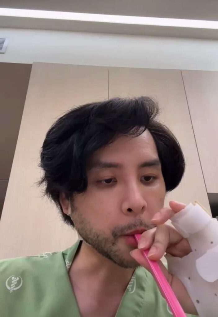 เนื่องจากที่กรามหัก ตอนนี้ปากถูกล็อกบน-ล่าง ไม่สามารถขยับกรามได้ตามปกติ และกรามที่หักใกล้เส้นประสาท คุณหมอประเมินว่าอาจต้องใช้เวลาประมาณ 3 เดือนกว่าจะสามารถใช้งานกรามได้ดีขึ้น ตอนนี้รูปหน้ามีเบี้ยวๆหน่อย คาดว่าช่วงปลายเดือน พ.ย. น่าจะกลับมาร้องเพลงได้