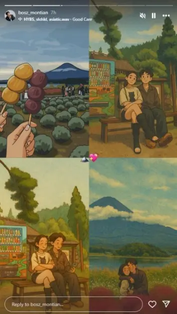 นอกจากนี้ บอส ยังได้โพสต์คลิปขณะอยู่กับหญิงสาวซึ่งหลายคนสังเกตว่าเป็น ลำไย รวมถึงภาพการ์ตูนที่วาดขึ้นจากภาพจริงที่ดูคล้ายกันอีกด้วย ทำเอาแฟนคลับพากันส่งหัวใจและคอมเมนต์ให้กำลังใจจำนวนมาก