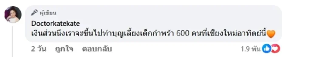 นอกจากนี้ หมอเคทยังเผยความตั้งใจว่า “เงินส่วนนึงเราจะขึ้นไปทำบุญเลี้ยงเด็กกำพร้า 600 คนที่เชียงใหม่อาทิตย์หน้า” พร้อมย้ำว่าปัญหายกเลิกตีกลับถือเป็นเรื่องเล็กน้อยเท่านั้น