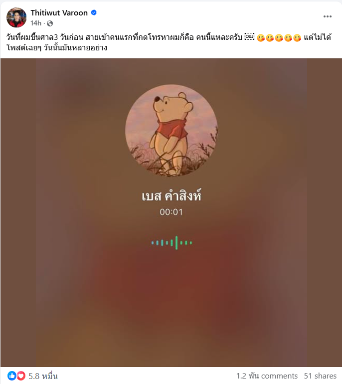 บิ๊ก ธิติวุฒิ หรือที่หลายคนรู้จักในชื่อ “บิ๊ก ผู้ใหญ่บ้านฟินแลนด์” ได้เผยถึงมิตรภาพลึกซึ้งกับ เบสท์ รักษ์วนีย์ นักแสดงและยูทูบเบอร์ชื่อดัง ในไทม์ไลน์เฟซบุ๊กของเขา โดยเล่าว่าในวันที่เขาต้อง “ขึ้นศาล” เบสท์คือคนแรกที่โทรเข้ามาหาเขา ให้กำลังใจในช่วงเวลาที่ยากลำบาก