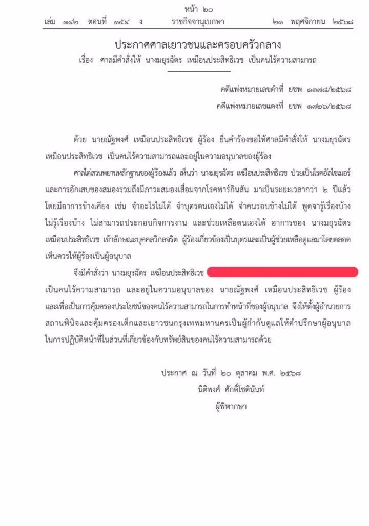 เมื่อวันที่ 21 พฤศจิกายน เว็บไซ์ราชกิจจานุเบกษา ประกาศศาลเยาวชนและครอบครัวกลางเรื่อง ศาลมีคำสั่งให้ นางมยุรฉัตร เหมือนประสิทธิเวช เป็นคนไร้ความสามามารถ