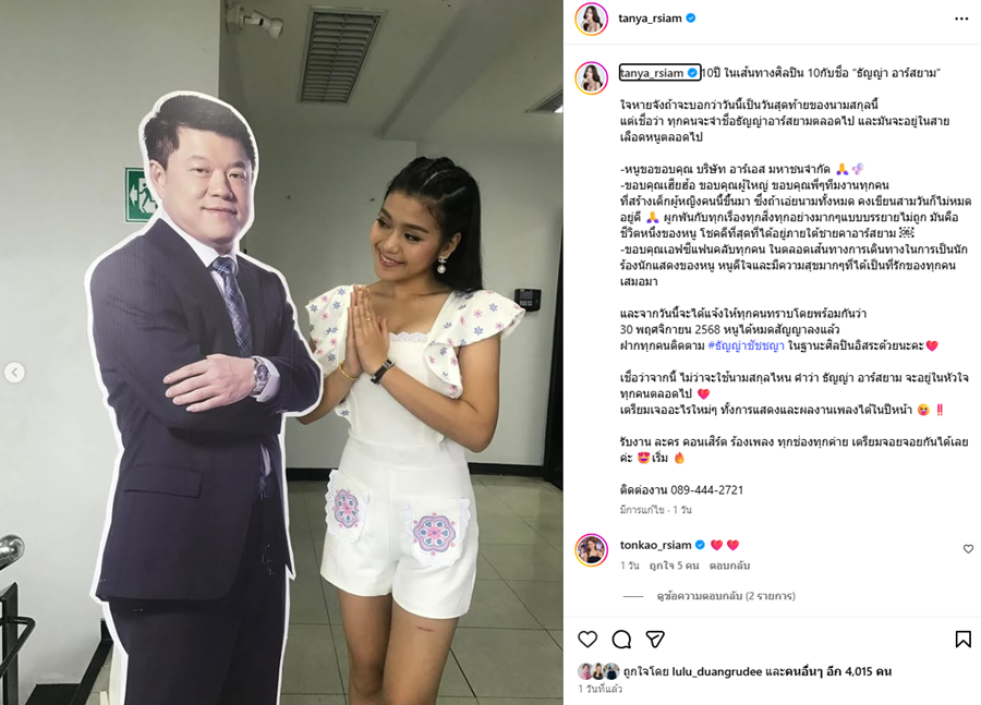 ทำเอานักร้องลูกทุ่งสาว ธัญญ่า อาร์สยาม ใจหายไม่น้อย เป็นวันสุดท้ายที่ใช้นามสกุล อาร์สยาม หลังอยู่ภายใต้ชายคาบ้านหลังนี้ เป็นเวลานาน 10 ปี ซึ่งหมดสัญญากับทางต้นสังกัด เมื่อวันที่ 30 พฤศจิกายน 2568 ก่อนจะผันตัวเป็นศิลปินอิสระ พร้อมเผยนามสกุลใหม่…
