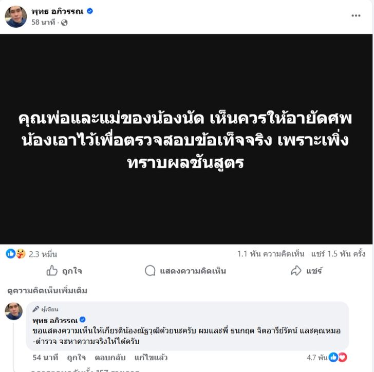 วันนี้ เวลา 13.15 น. นายพุทธ อภิวรรณ ผู้อำนวยการฝ่ายข่าวของช่อง 8 และผู้ประกาศข่าวคนดัง โพสต์เฟซบุ๊กส่วนตัว ยืนยันว่า คุณพ่อและแม่ของ ณัฐวุฒิ ปงลังกา เห็นควรให้อายัดศพไว้ก่อนทำการฌาปนกิจ เพื่อตรวจสอบข้อเท็จจริง ภายหลังทราบผลชันสูตร