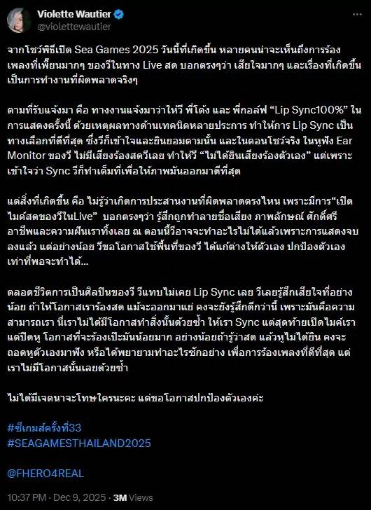 ล่าสุด วี ได้ออกมาร่ายยาวถึงเหตุดังกล่าวว่า จากโชว์พิธีเปิด Sea Games 2025 วันนี้ที่เกิดขึ้น หลายคนน่าจะเห็นถึงการร้องเพลงที่เพี๊ยนมากๆ ของวีในทาง Live สด บอกตรงๆว่า เสียใจมากๆ และเรื่องที่เกิดขึ้น เป็นการทำงานที่ผิดพลาดจริงๆ