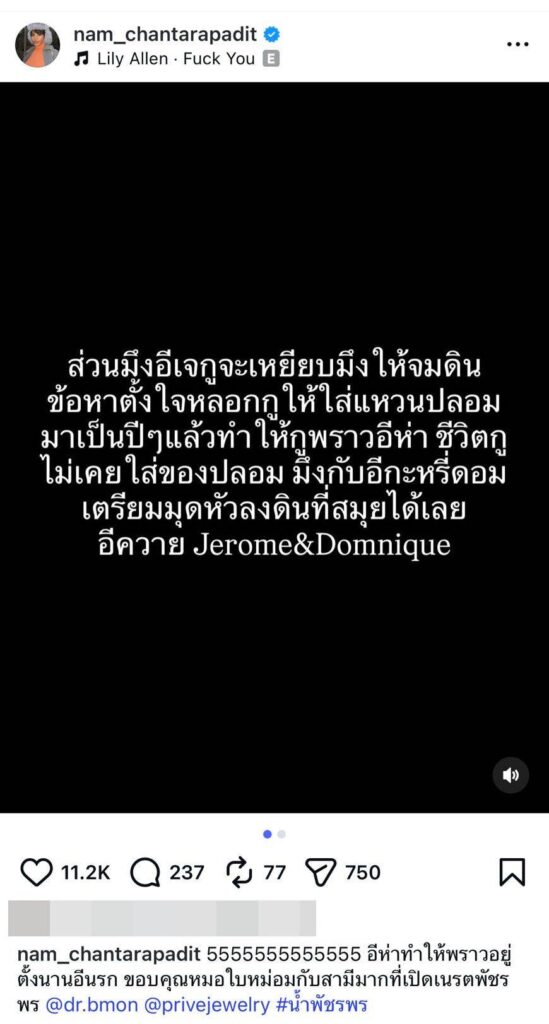 “ส่วนมึงอีเจกูจะเหยียบมึงให้จมดิน ข้อหาตั้งใจหลอกกูให้ใส่แหวนปลอมมาเป็นปีๆ แล้วทำให้กูพราว อี ชีวิตกูไม่เคยใส่ของปลอม มึงกับอีกะ เตรียมมุดหัวลงดินที่สมุยได้เลยอี_”