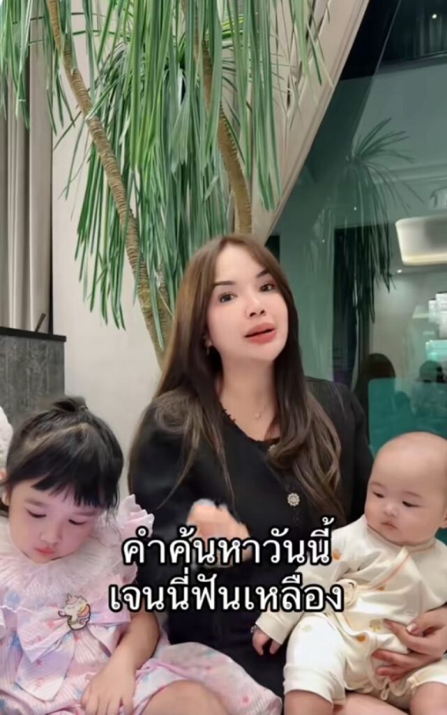 ร้อนถึงสาวเจนนี่ต้องรีบออกมาอัดคลิปชี้แจงแถลงไขเป็นการด่วน โดยเธอยอมรับพร้อมเสียงหัวเราะว่าเห็นคำค้นหาเรื่องฟันเหลืองแล้ว จึงขออธิบายสาเหตุที่ทำวีเนียร์แค่ฟันบนว่า จริงๆ แล้วตั้งใจจะทำทั้งปาก แต่หลังจากทำฟันบนเสร็จและต้องรอพัก 1 สัปดาห์เพื่อทำฟันล่างต่อ ดันตรวจพบว่ากำลังตั้งท้อง “น้องจาญ่า” พอดี ซึ่งแพทย์แนะนำว่าช่วงท้องอ่อนๆ ห้ามทำฟันเด็ดขาด ทำให้โครงการทำสวยต้องพับเก็บไปยาวๆ จนกว่าจะคลอด
