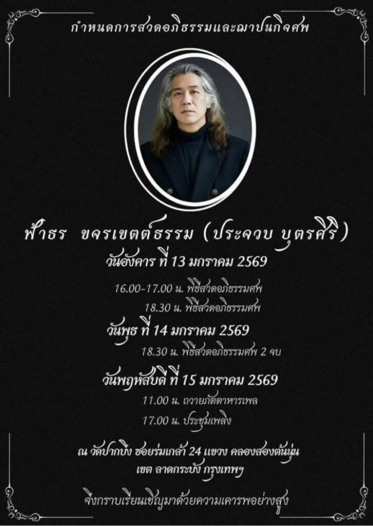 กำหนดสวดอภิธรรม นายฟ้าธร ขจรเขตต์ธรรม (ประจวบ บุตรศิริ) ณ วัดปากบึง ซอยร่มเกล้า 24 แขวง คลองสองต้นนุ่น เขต ลาดกระบัง กรุงเทพฯ