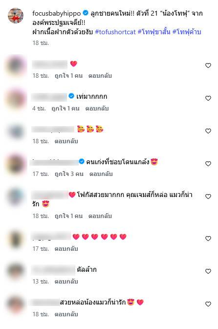 เรียกได้ว่าเป็นอีกหนึ่งโมเมนต์อบอุ่นของคู่รักสายทาสแมวที่มักจะมีเรื่องราวน่ารักๆ มาให้เราได้ยิ้มตามอยู่ตลอด ถึงแม้ลูกชายคนนี้จะเป็นสมาชิกสี่ขา แต่ก็เห็นได้ชัดว่าทั้งโฟกัสและเจมส์ต่างก็เห่อสมาชิกใหม่คนนี้อยู่ไม่น้อยเลยทีเดียว ใครที่อยากเห็นความซนของน้องโทฟุและพี่ๆ อีก 20 ตัว ก็สามารถตามไปดูได้ที่ไอจีของสาวโฟกัสได้เลย รับรองว่าทาสแมวเห็นแล้วต้องใจละลายแน่นอนค่ะ
