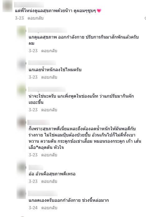 ทันทีที่คลิปและภาพถูกเผยแพร่ออกไป คอมเมนต์ในโซเชียลมีเดียก็หลั่งไหลเข้ามาอย่างท่วมท้นค่ะ ส่วนใหญ่เป็นไปในทิศทางเดียวกันคือความห่วงใย โดยแฟนคลับต่างพากันเข้ามาทักด้วยความกังวลใจ เช่น